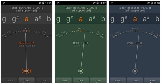 สำหรับแอป Tuner gStrings เป็นอีกหนึ่งแอป ที่ได้รับความนิยมมากจากมือกีต้าร์ ส่วนใหญ่ผู้ใช้ประทับใจกับแอพฯ นี้ค่อนข้างเยอะ เพราะใช้ได้จริง ใช้งานง่าย ไม่มีปัญหาแอพฯ เพี้ยน ตั้งสายได้แม่นยำ มีความละเอียดในการจูนสูง แอปนี้ตั้งได้ตั้งแต่ กีต้าร์ 6 สาย 7 สาย 12 สายกีต้าร์ไฟฟ้า กีต้าร์โปร่ง กีต้าร์เบส และอื่นๆอีกมากมาย ฟังก์ชั่นการใช้งานมีมากมายไม่ว่าจะเป็น การดรอปสาย หรือ Open String ในคีย์ต่างๆ นอกจากนี้ยังมีโหมด Orchestra Tuner ที่สำหรับตั้งเสียงวงเครื่องสายออเคสตร้าต่างๆ