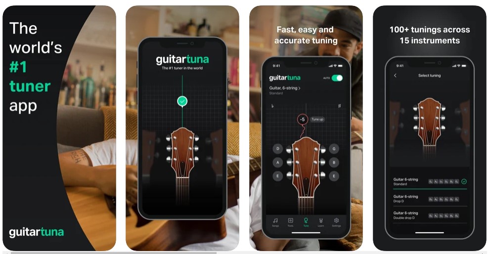 มาเริ่มกันที่ App แรก แอปนี้ชื่อว่า Guitar Tuna แอฟนี้เป็นแอป ที่ได้รับความนิยมเป็นอย่างมากเพราะใช้ง่ายและเสถียร แถมยังมีฟังก์ชันต่างๆให้ได้เลือกใช้งานมากมาย สามารถตั้งได้ทั้ง กีต้าร์โปร่ง กีต้าร์ไฟฟ้า กีต้าร์เบส รวมไปถึงอูคูเลเล่และไวโอลิน เรียกได้ว่า เป็นหนึ่งในแอพฯ tuner ที่ดีที่สุดในขณะนี้ มีความแม่นยำในการรับเสียงสูง นอกจากนี้ยังสามารถเลือกโหมดตั้งสายเครื่องดนตรีอื่นๆอีกมากมาย เช่น เบส อูคูเลเล่ หรือ ไวโอลีน เรียกได้ว่า แอพฯ เดียวจบเลย