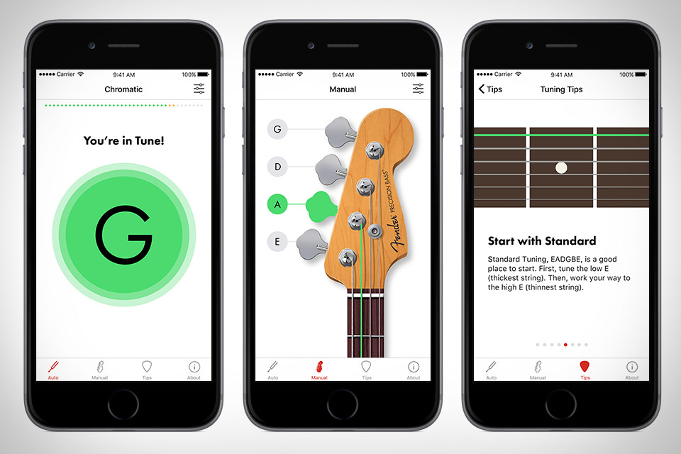แอปนี้เป็นแอป ของแบรนด์กีต้าร์ระดับโลก ที่ชื่อ Fender โดยใช้ชื่อ App ว่า Fender Tuner เป็น App ที่รองรับทั้ง กีต้าร์โปร่ง กีต้าร์ไฟฟ้า กีต้าร์เบส และคูเลเล่ หน้าตาของแอปพลิเคชันมีความเรียบง่ายใช้งานง่าย แถมยังมีระบบ Auto ที่ช่วยเซ็ตค่าโน้ตในแต่ละสายได้อย่างง่ายดาย จะตั้งเป็นแบบโครมาติกก็ได้ หรือจะเลือกตั้งแบบแมนนวลก็ได้
