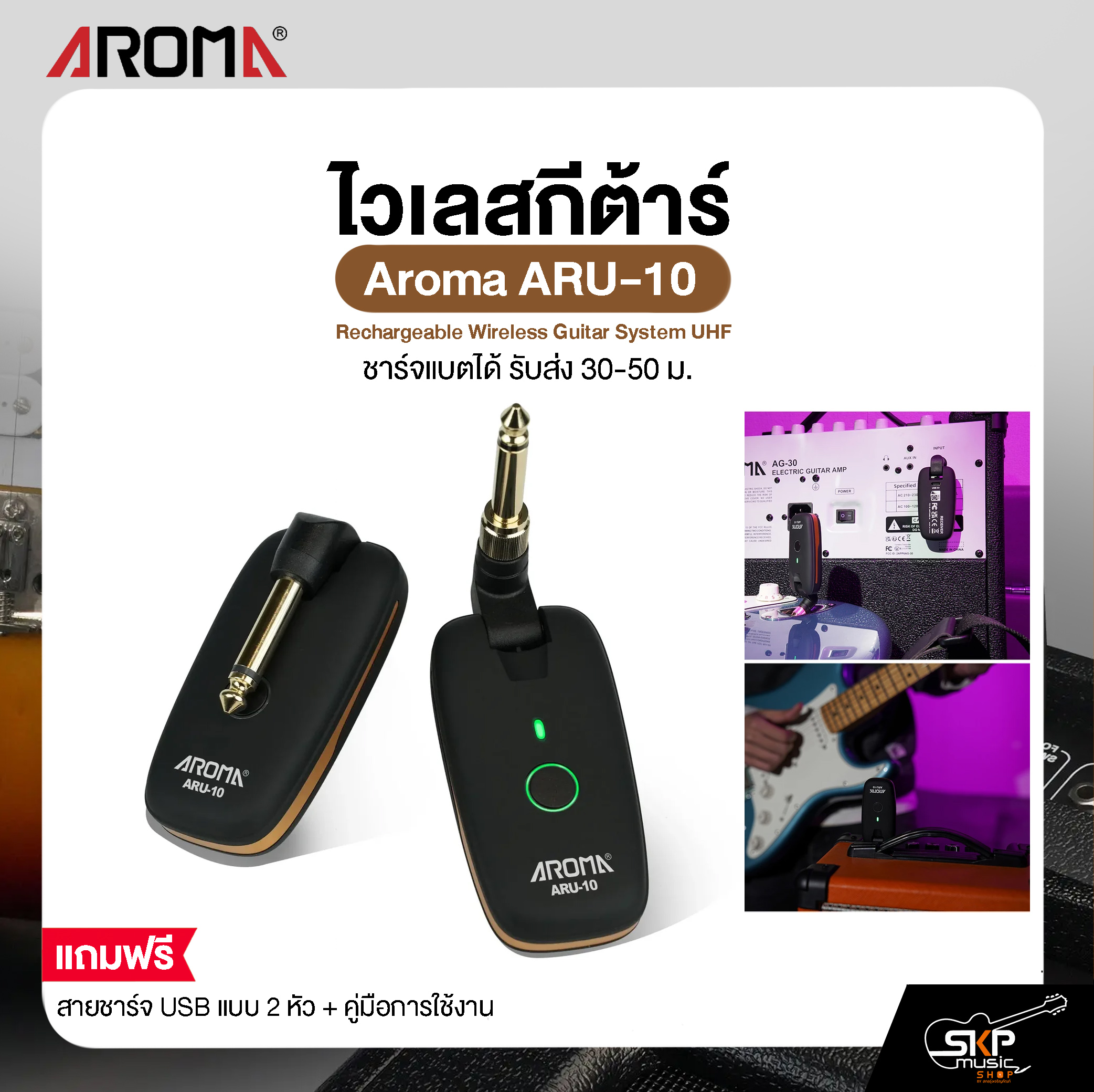 Aroma ARU-10 ไวเลสกีตาร์ระบบ UHF ที่ออกแบบมาเพื่อให้นักดนตรีเคลื่อนไหวได้อย่างอิสระบนเวที ไม่ต้องกังวลเรื่องสายแจ็คพันกันอีกต่อไป เหมาะสำหรับทั้ง กีตาร์ไฟฟ้า, กีตาร์โปร่งไฟฟ้า, เบส, และเครื่องดนตรีอื่น ๆ