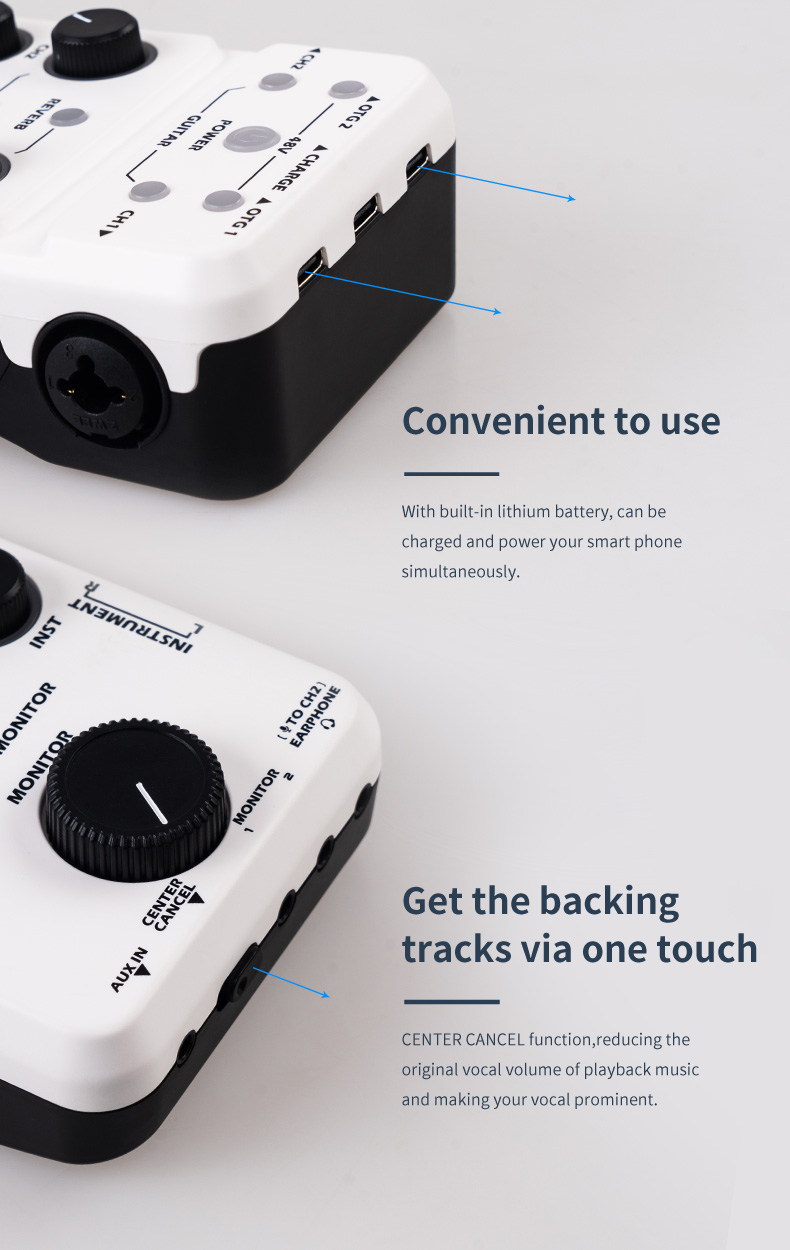 【ฟังก์ชันการชาร์จแบบคู่】อินเตอร์เฟซเครื่องเสียงนี้ไม่เพียงแต่ชาร์จเองเท่านั้นแต่มันยังรองรับโทรศัพท์ของคุณการชาร์จพร้อมกัน ฟีเจอร์นี้ช่วยให้มั่นใจได้ว่าพลังงานคุณไม่เคยหมดในระหว่างการบันทึกหรือเซสชันสตรีมสด เชื่อมต่ออยู่เสมอและมีพลังงานด้วยเครื่องผสมแบบพกพานี้