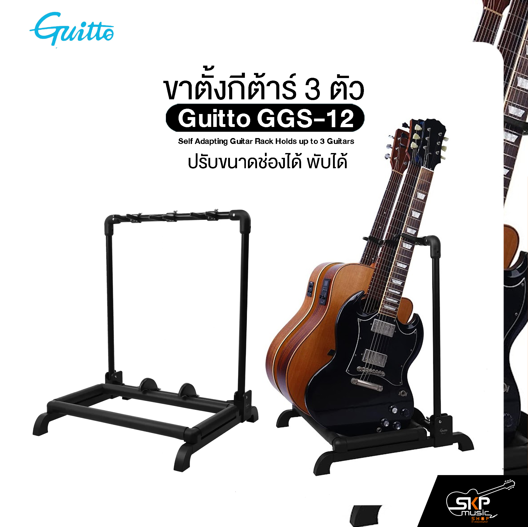 Guitto GGS-12 คือขาตั้งกีตาร์แบบเรียงแถวสำหรับผู้ที่ต้องการจัดเก็บกีตาร์อย่างเป็นระเบียบ รองรับการวางกีตาร์ได้พร้อมกัน สูงสุด 3 ตัว โดยจุดเด่นคือ แต่ละช่องสามารถปรับความกว้างได้อิสระช่วยลดการกระแทกและป้องกันกีตาร์ชนกัน เหมาะกับกีตาร์หลากหลายขนาดและรูปทรงโครงสร้างทำจาก พลาสติกอ่อนคุณภาพสูง ผสานท่อเหล็กทรง U แข็งแรง มั่นคงทุกจุดสัมผัสมี โฟมนุ่มรองรับ ช่วยป้องกันรอยขีดข่วนที่ตัวกีตาร์ สามารถ พับเก็บได้ ใส่กล่องแบน ประหยัดพื้นที่ เคลื่อนย้ายสะดวก