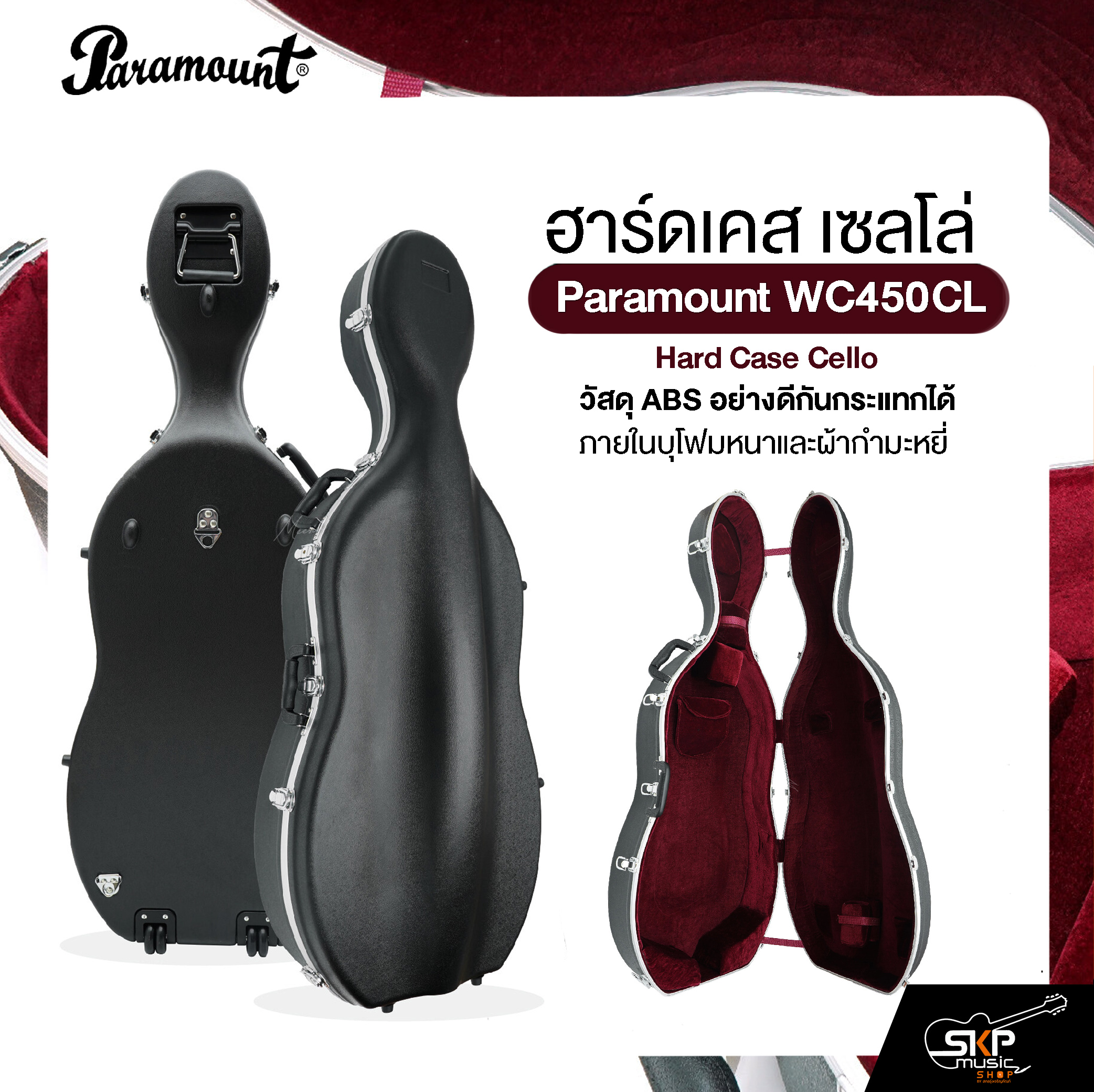 Paramount WC450CL Hard Case Cello ฮาร์ดเคสเชลโล่คุณภาพสูง ผลิตจาก พลาสติก ABS อย่างดี แข็งแรง ทนทาน แต่น้ำหนักเบา ออกแบบมาเพื่อปกป้องเชลโล่จากแรงกระแทก รอยขีดข่วน และความเสียหายระหว่างการขนย้าย