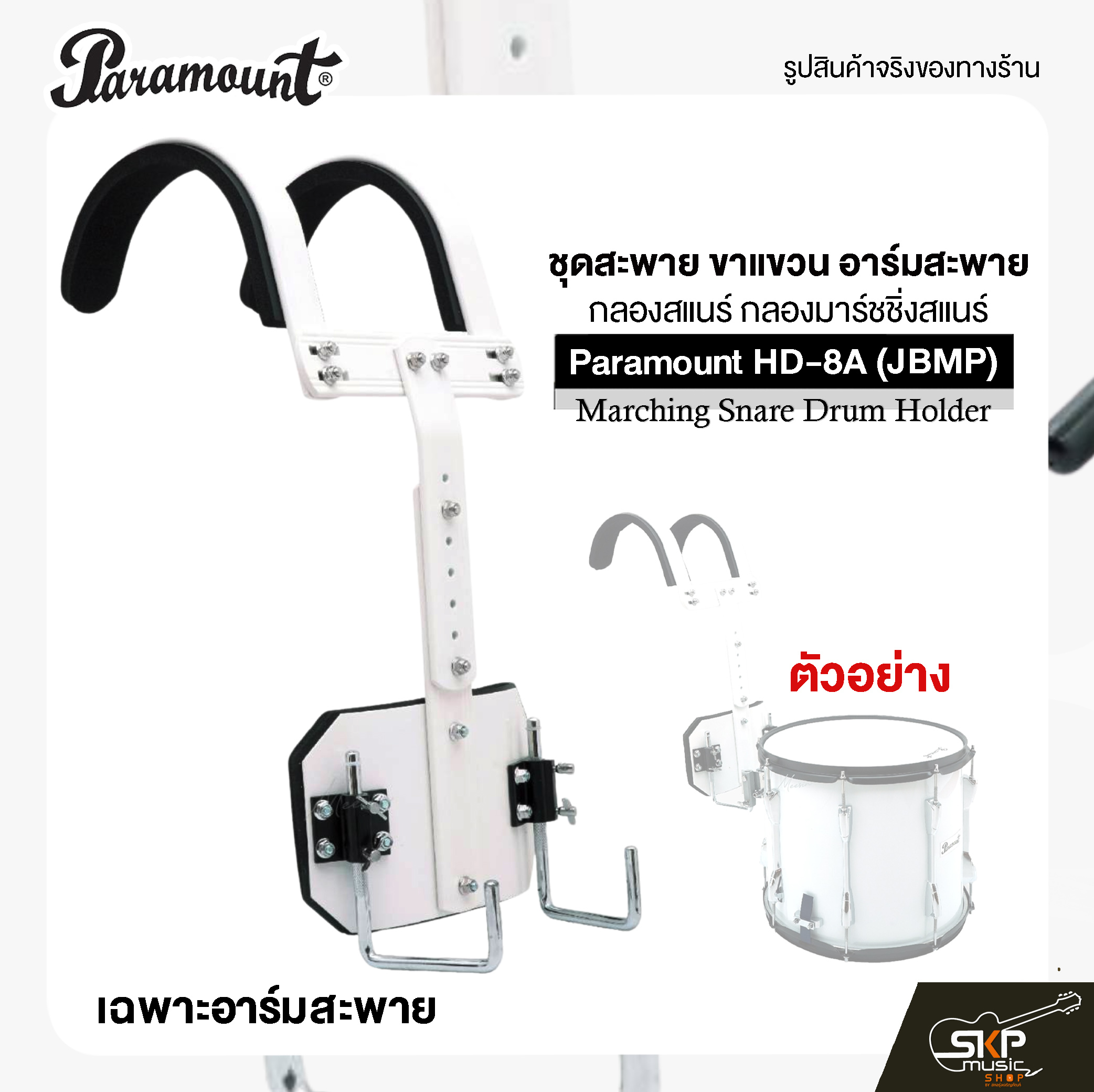 Paramount HD-8A (JBMP) ชุดสะพายกลองสแนร์สำหรับวงโยธวาทิตและการแสดงพาเหรด ออกแบบมาเพื่อความคล่องตัว แข็งแรง และสวมใส่สบาย ช่วยให้ผู้เล่นควบคุมตำแหน่งกลองได้มั่นคงตลอดการเดินขบวน