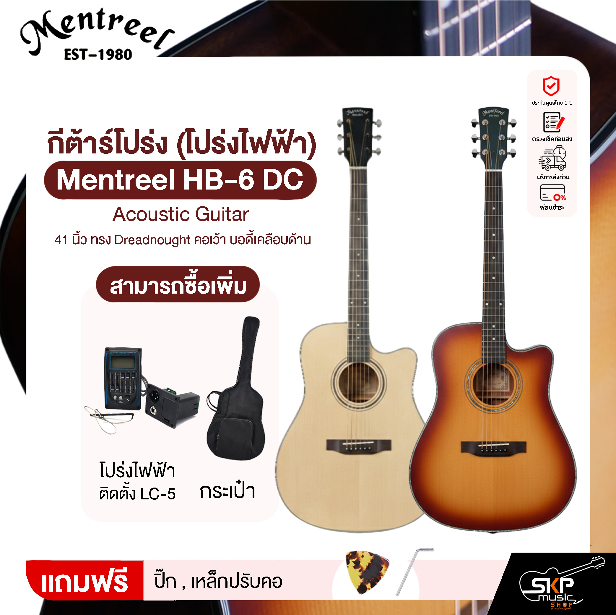 Mentreel HB-6 DC กีตาร์โปร่งขนาด 41 นิ้ว ทรง Dreadnought คอเว้า ให้พลังเสียงดัง เต็ม เหมาะกับการตีคอร์ด ร้องเพลง และเล่นโฟล์ค