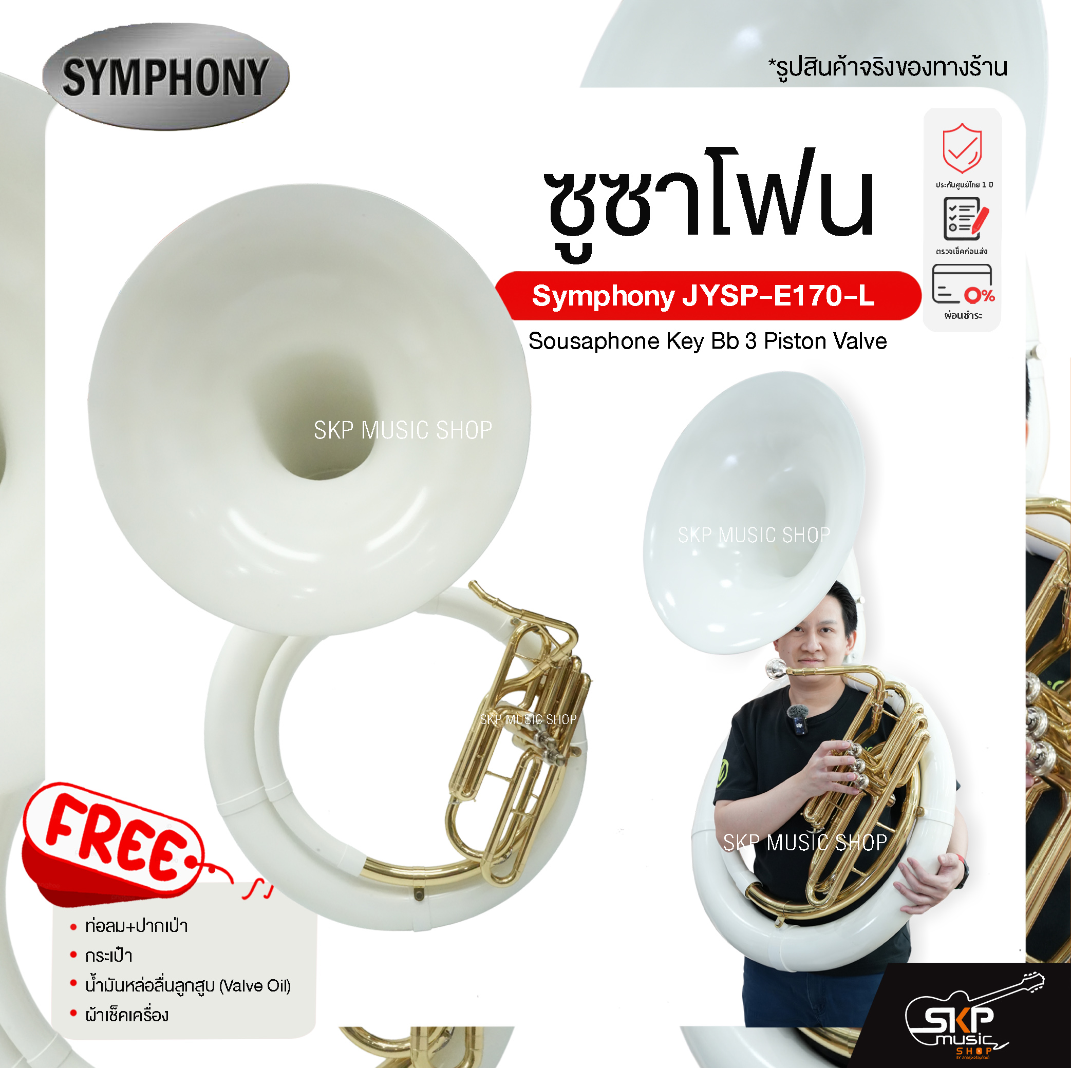 ซูซาโฟน Symphony รุ่น JYSP-E170-L เครื่องดนตรีทองเหลืองสำหรับวงโยธวาทิตและวงมาร์ชชิ่ง ให้เสียงต่ำที่หนา ลึก กังวาน และทรงพลัง เหมาะสำหรับการเดินสนาม ขบวนพาเหรด และการแสดงกลางแจ้ง ตัวเครื่องออกแบบตามสรีระผู้เล่น ใส่สบาย น้ำหนักสมดุล ใช้งานได้ยาวนาน