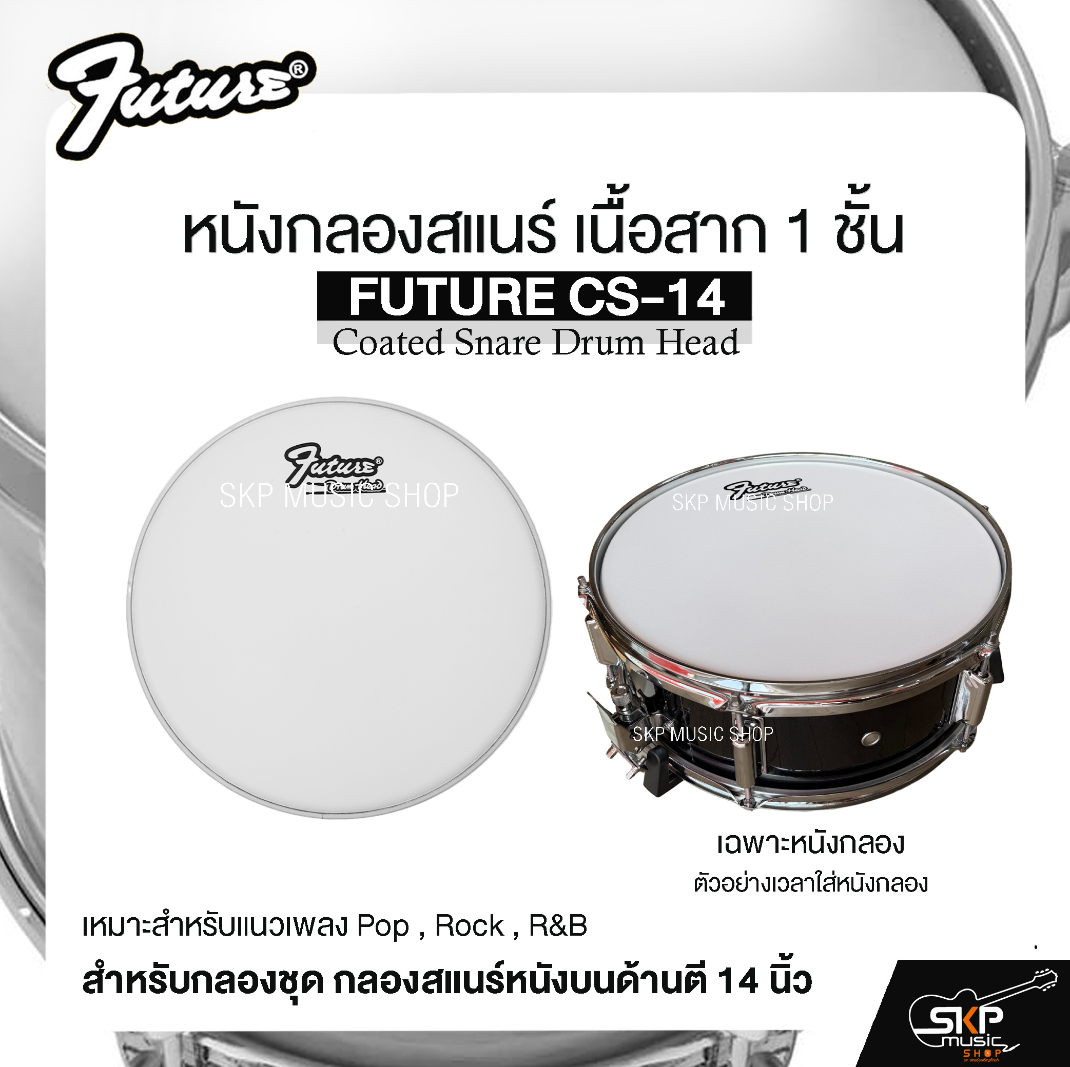 หนังกลองสแนร์ FUTURE CS-14 เป็นหนังกลองแบบ Coated (เนื้อสาก) ให้สัมผัสที่เหมาะกับมือกลองทุกระดับ โดยเฉพาะสายตีแนว Pop / Rock / R&B